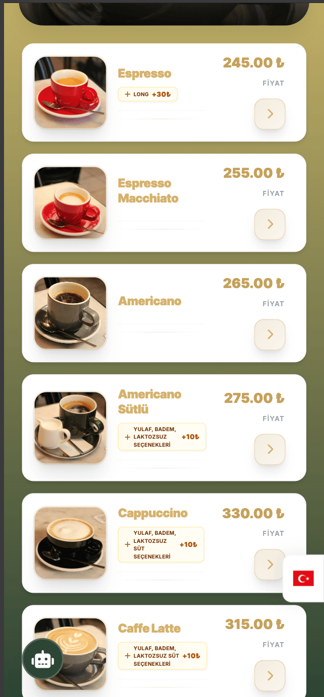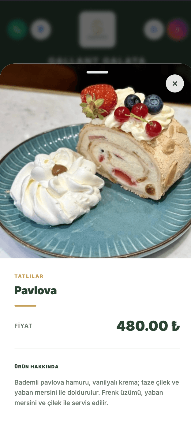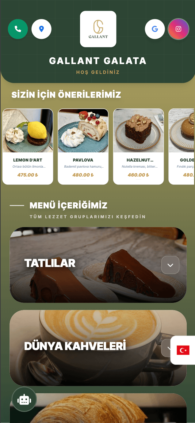 Gallant Galata için modern ve kullanıcı dostu bir dijital menü deneyimi tasarladık. QR menü entegrasyonu ile misafirlerin menüye kolayca erişmesini sağladık.